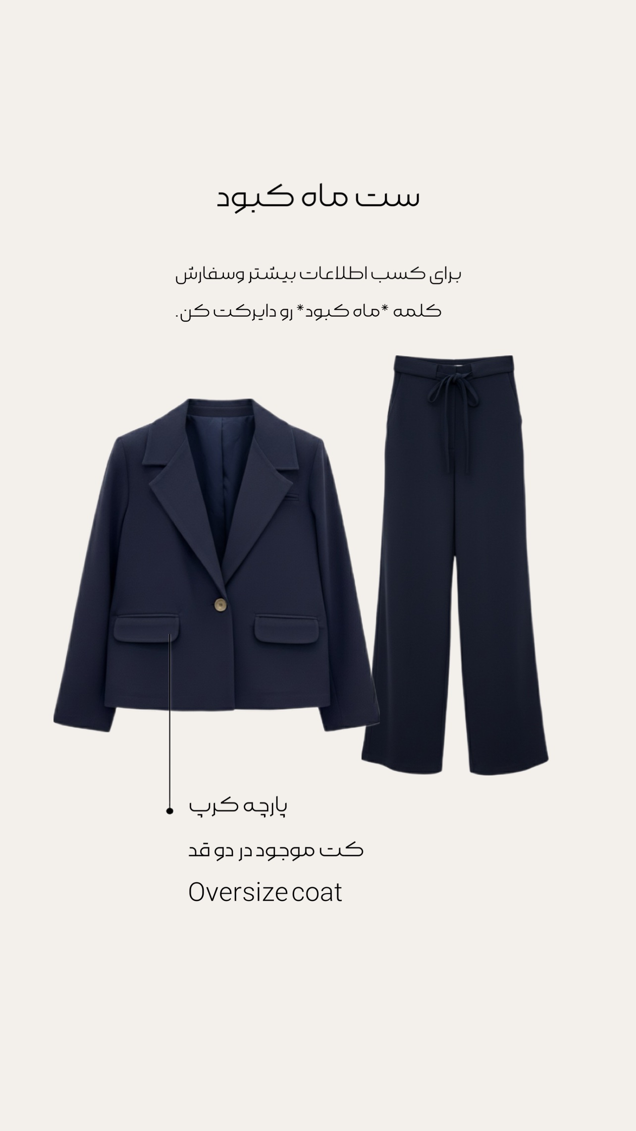 مشخصات اصلیاستر / استر دار / بدون استررنگ کت / سرمه ای / مشکیقدکت / قد۶۳ / قد۷۳مشخصات فرعیجنس پارچهکرپ مرويجت